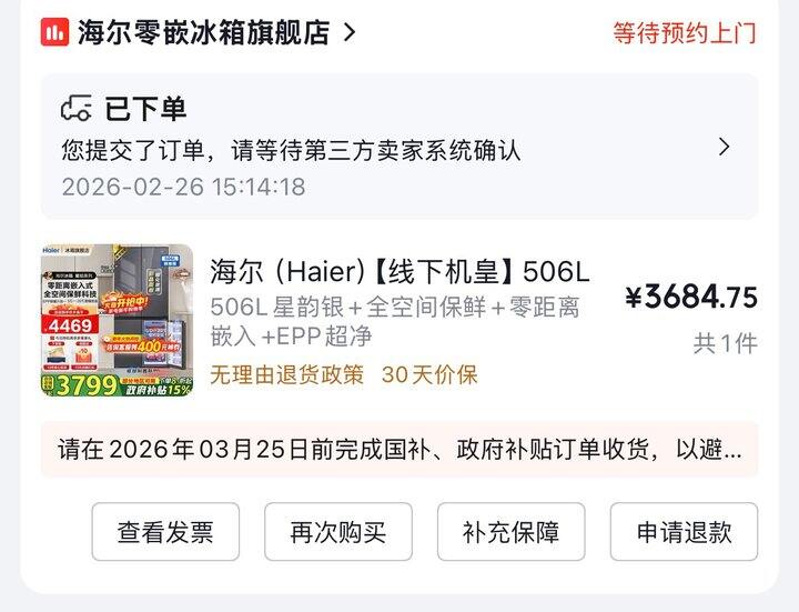 家里冰箱坏了,家人在海尔实体店看好让在网上买的,实体店只有国补活动,还是京东比较划算,评价也不错,叠加国补和以旧换新到手3600多