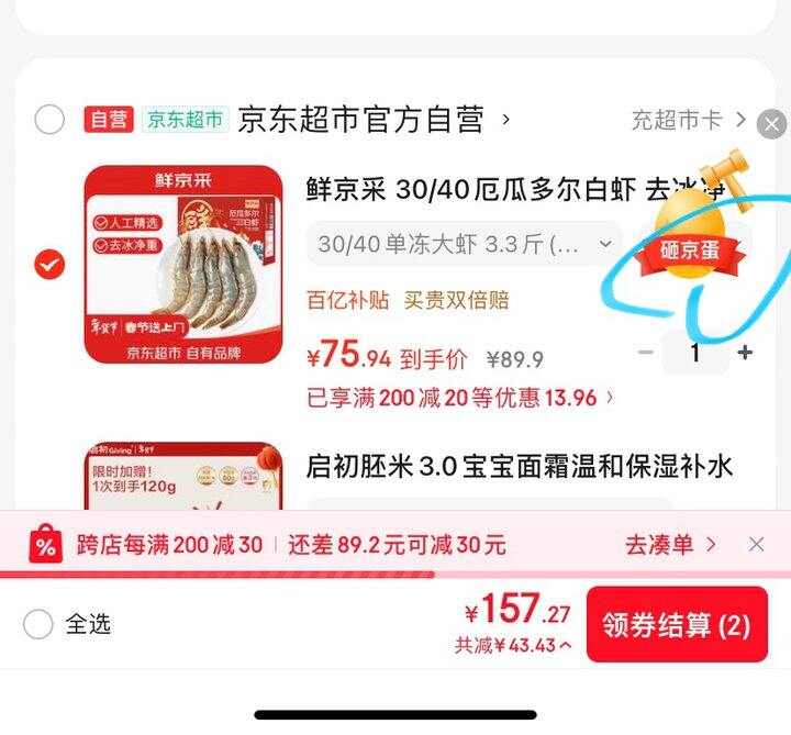 1,鲜京采 30/40厄瓜多尔白虾 去冰净重3.3斤 50-66只/盒