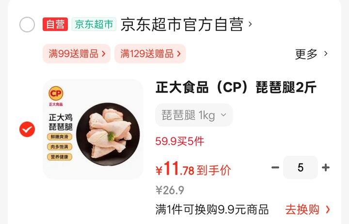 【自营】CP正大 白羽鸡琵琶腿 2斤