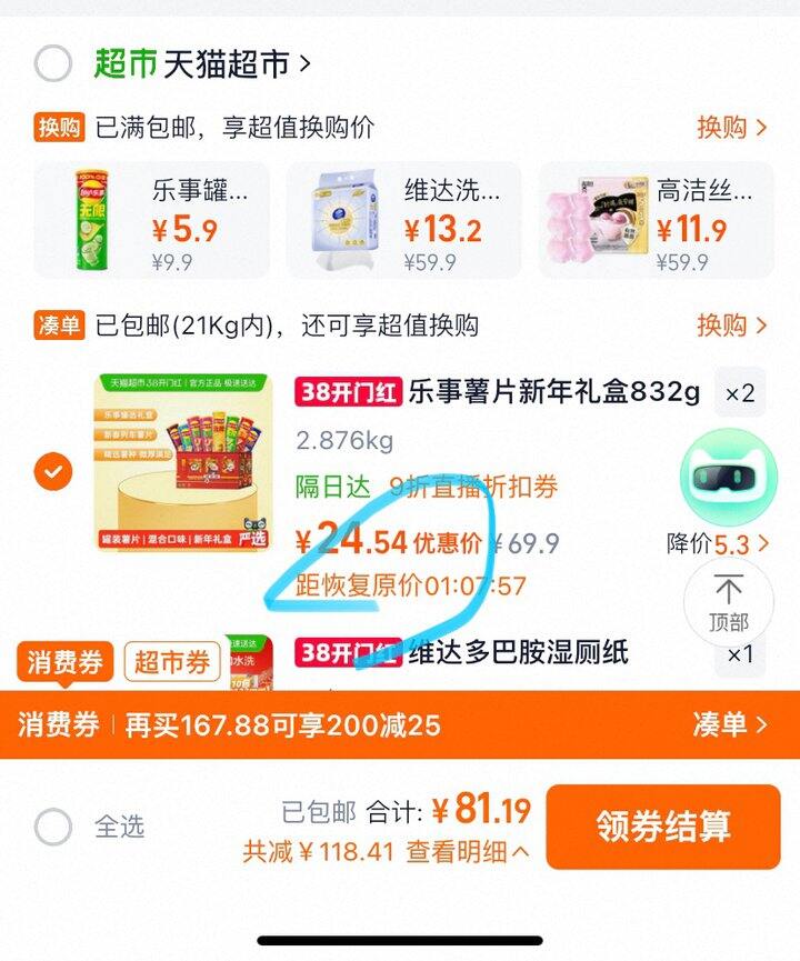 猫超首页点击超级补贴,页面顶部领取39-6,找到它,加购