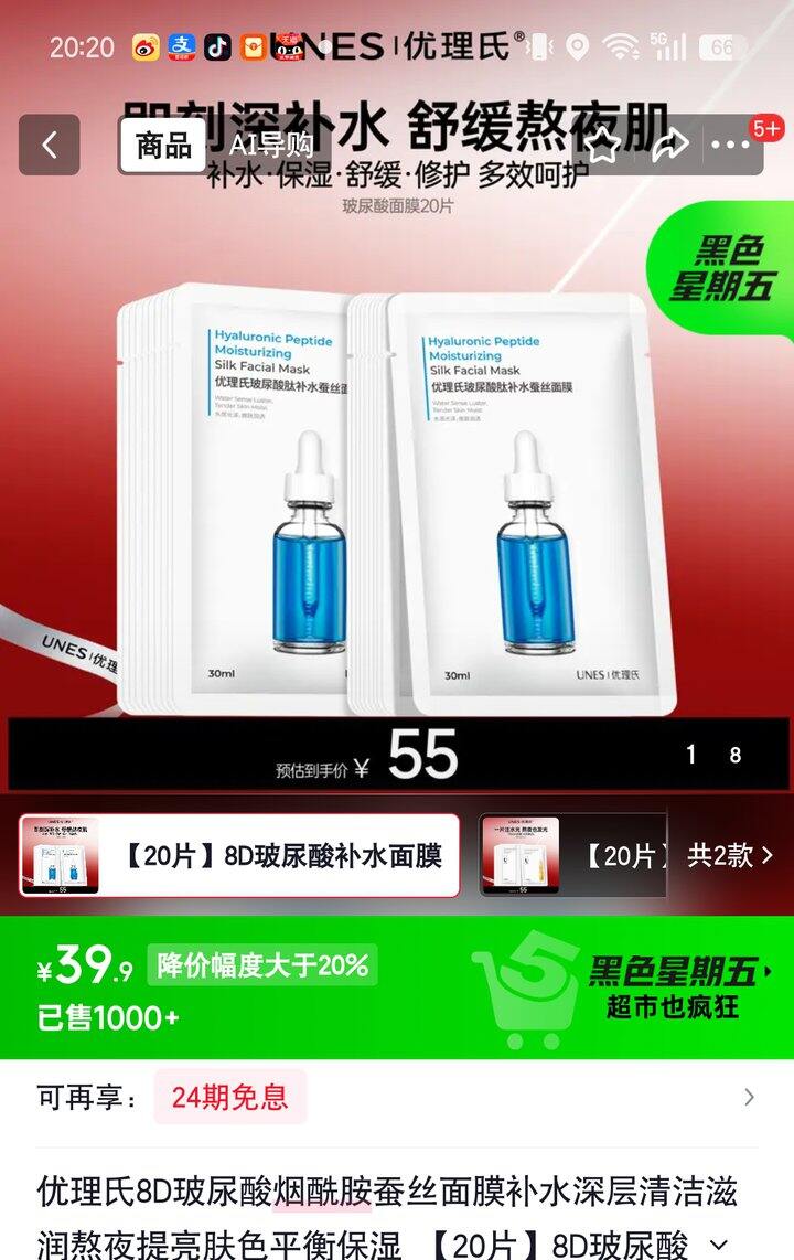 ❷玻尿酸面膜𝟐𝟎片【21.9】