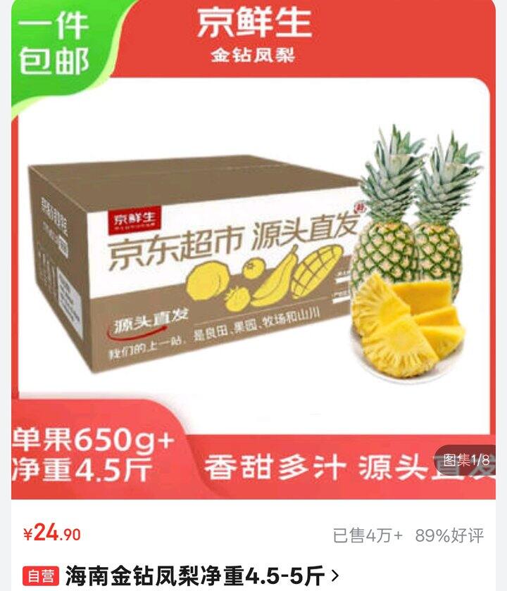 京鲜生 海南金钻凤梨 净重4.5-5斤