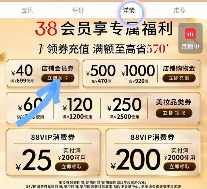❹下拉详情页领699-40店铺券
