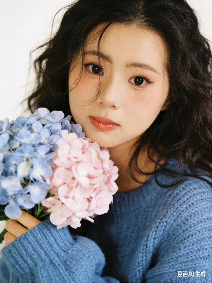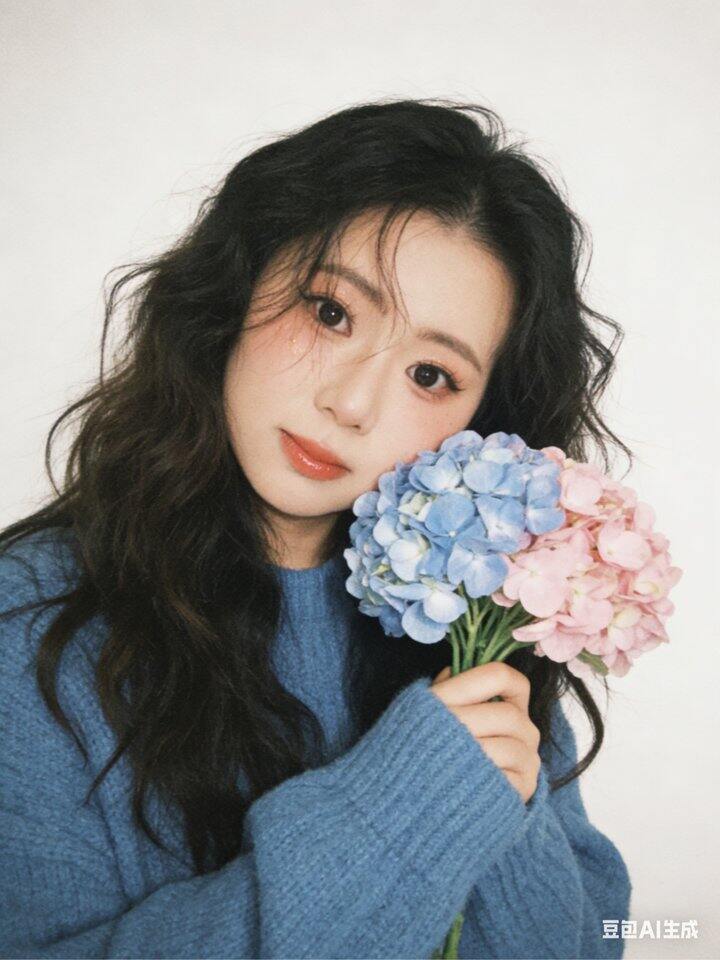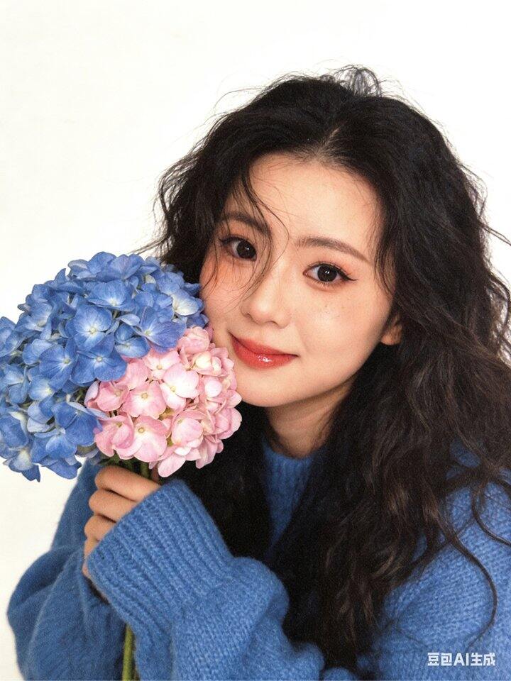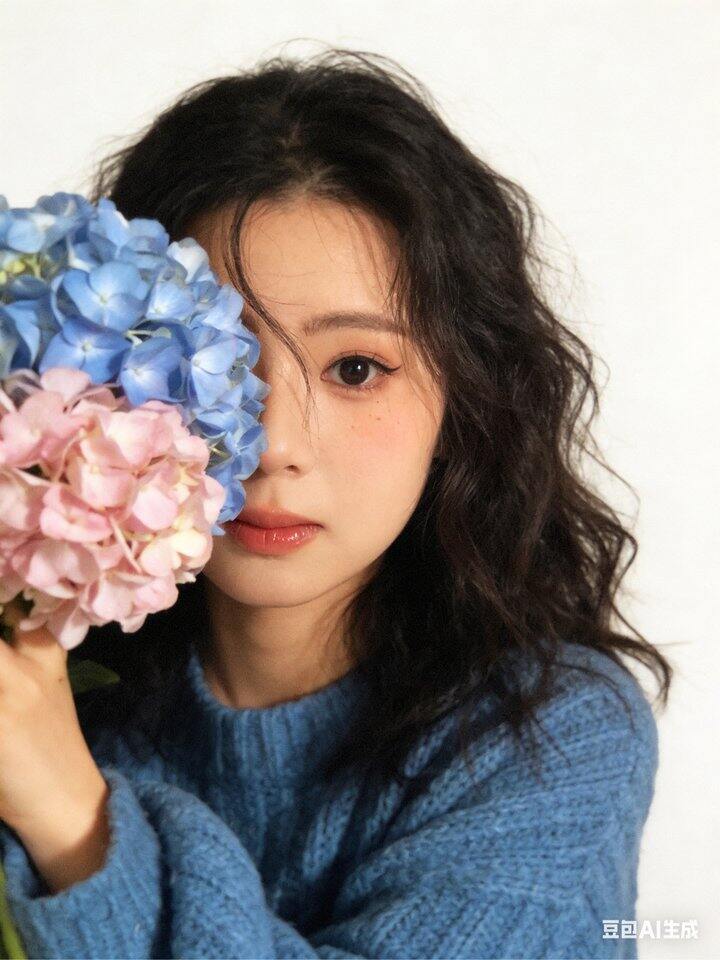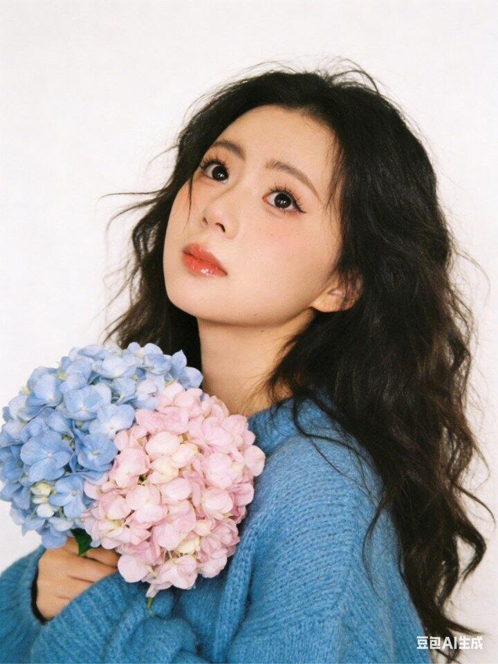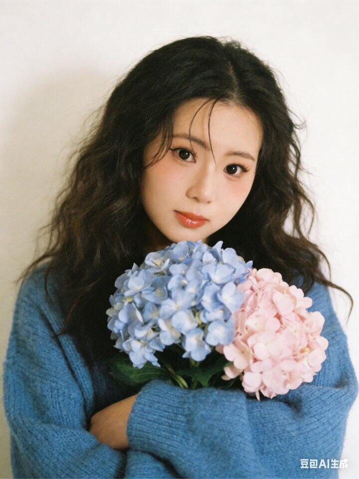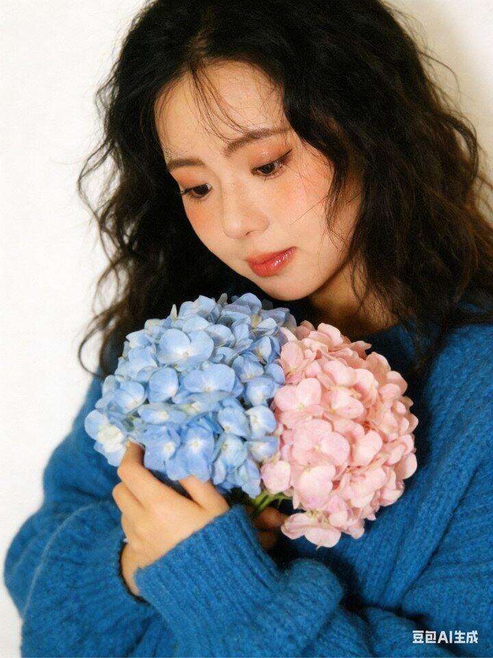 手持蓝粉色绣球花束,脸颊或下巴轻轻挨着花束,多角度的特写镜头,情绪氛围感,营造柔和朦胧氛围,古早味,妆容自然,网感头像。原比例。九张的表情丰富一些,比例 「3:4」