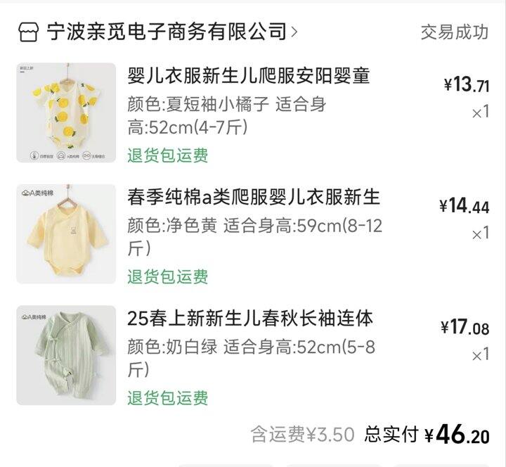 8.衣服,不推荐,新生儿宝宝必须纯棉,去实体看更好,52码我家娃穿了一个星期不到,对她来说太小了,她刚出生大概6斤5左右,衣服建议准备十几套,遇到雨天和宝宝吐奶,几套是不够的(还好家里集美有经验给我娃准备了多套,我刚开始看医院写的,只准备了三套)