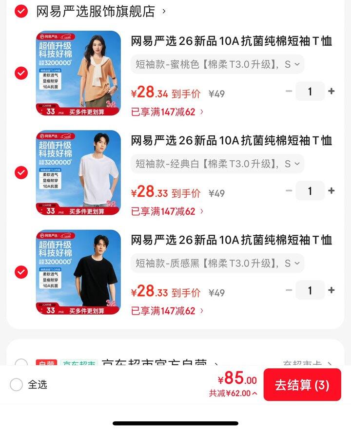 网易严选10A抗菌纯棉短袖T恤丨28.3