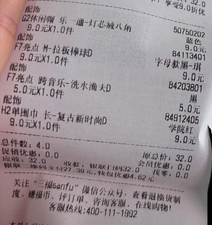 姐妹们看看你们的线下三福门店,帽子围巾打折。好划算。我买了三个帽子给我姐买了一条围巾叠加云闪付27块多,忘记去🐟买会员卡了不然也可以优惠。帽子还是要线下试才知道合不合适。我大部分的帽子都是三福购入的,季度打折的时候性价比很高,而且质量也还不错。相比绿光派对和纪念日三福打折是最频繁的了。等我回去晒单!