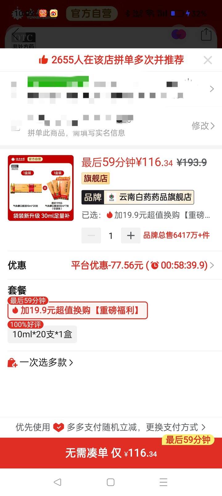话不多说,看图,平常用的号是6.5折126,不常用的号显示6折116,拍19.9换购这个,到手10毫升×20瓶➕30毫升×7(这个是袋装的),相当于买一送一了。