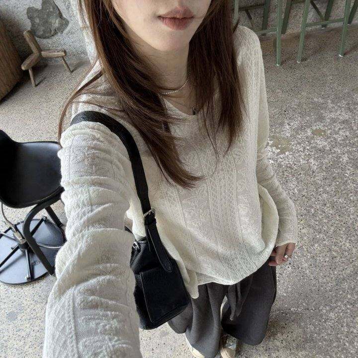 温柔复古羊毛混纺米白色蕾丝V领T恤女波浪下摆针织打底衫2026春秋
