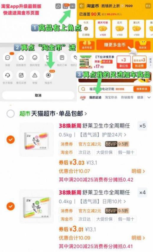 vip 27,折3/包,右上角‘淘金币’加9件舒莱 日夜用纯棉卫生巾 最多216片