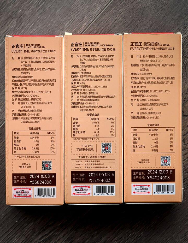 ✅正官庄红参麦卢卡蜂蜜饮品配料表很干净,只有麦卢卡蜂蜜、红参和水选用的是人工种植5年及5年根以下的人参,毕竟国人不像泡菜国人长期服用红参对红参的适应性比较差,所以建议先从低年根红参入手进行尝试、再配上麦卢卡蜂蜜蜂蜜的香甜中和了红参的苦味,还很容易入口~