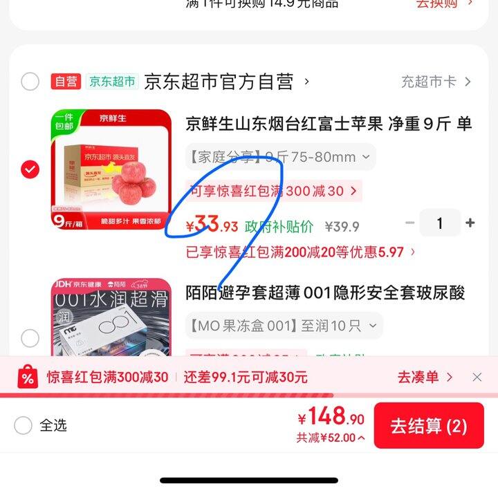 1,京鲜生山东烟台红富士苹果 净重9斤 单果75-80mm