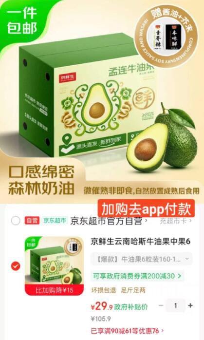 【自营包邮】京鲜生 云南哈斯牛油果 6粒 (单果160-190g)-https://u.jd.com/N6bGngH