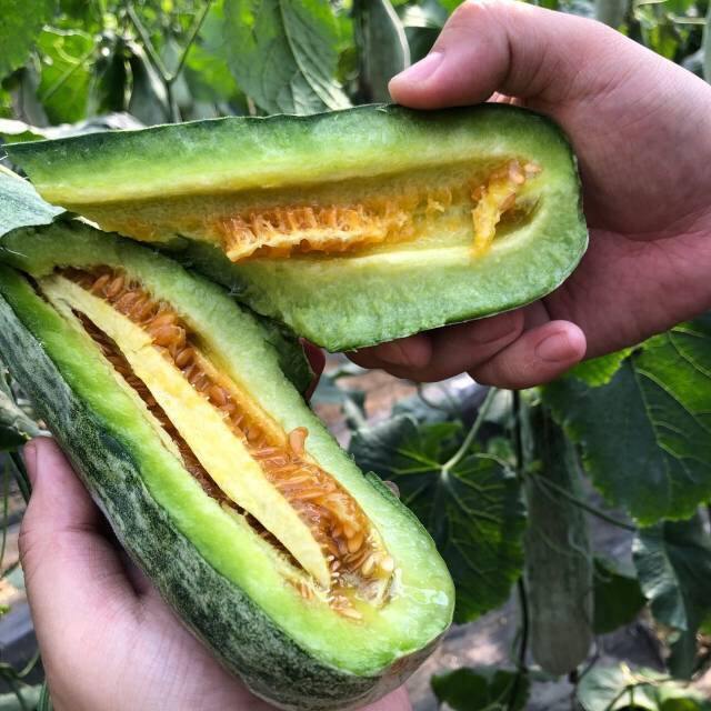 来自山东的新起之秀水果,因形似羊角、口感如蜜而起名之为羊角蜜~🤫我觉得它更像一个加宽版的棒球棒~🥒 潍坊羊角蜜🪄它的果肉颜色翠绿,口感脆爽多汁💦,羊角蜜瓜的籽小还比较嫩,所以是可以直接食用~~