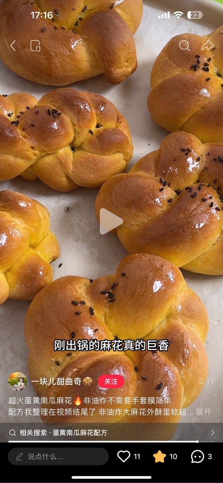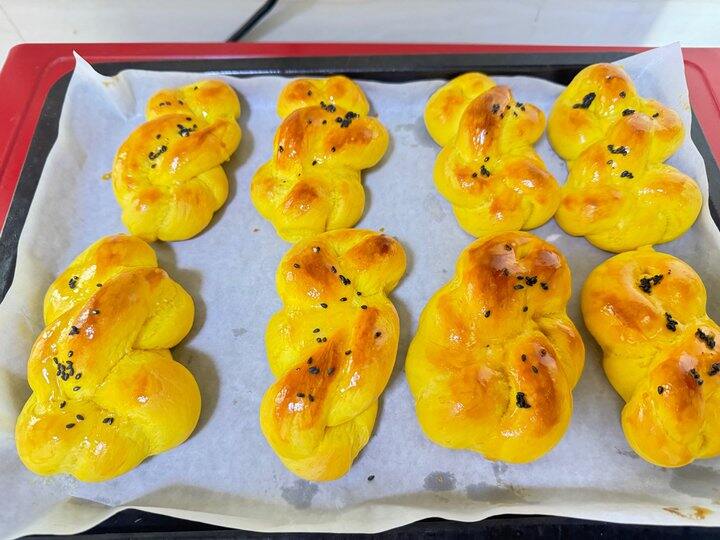 复盘:油我用黄油,奶香浓郁。最后十分钟有刷蛋黄液,然后烤五分钟再刷蜂蜜和芝麻,颜色更鲜亮,口感也更好。