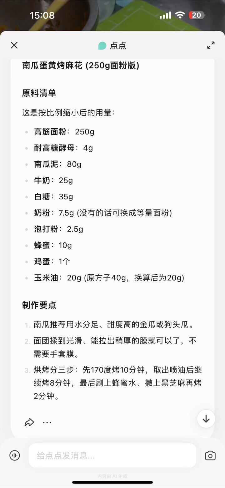 ⬇️用的这个视频菜谱配方,然后现在有个好处不用自己换算,小红书发给它系统自带的“点点”,它会帮忙换算。