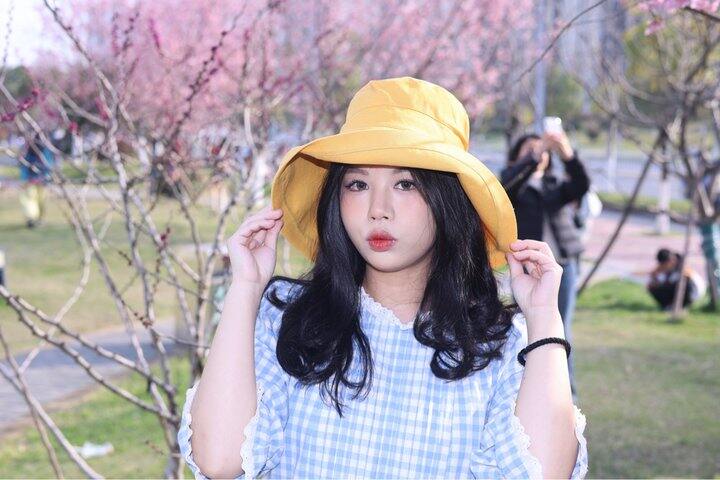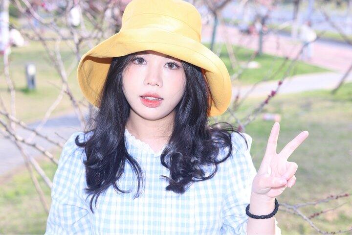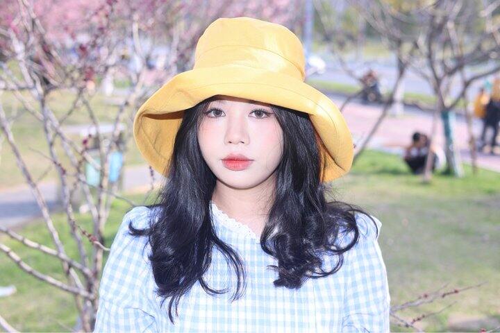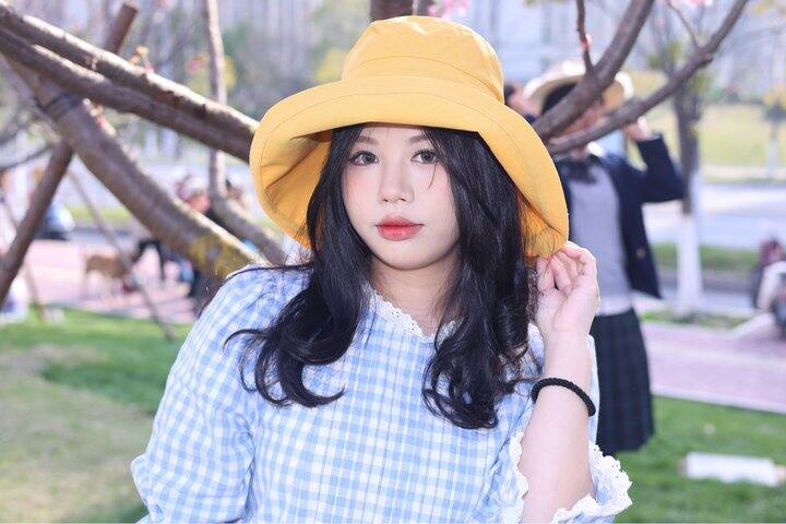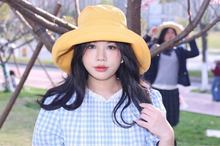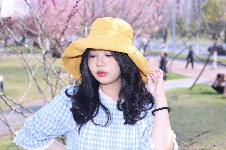 1️⃣黄色真的太有活力啦!戴上感觉整个人都饱和度鲜明超级显白,帽檐是盆帽的设计~往上折一些戴更好看一些!有种樱桃小丸子的即视感,可可爱爱~