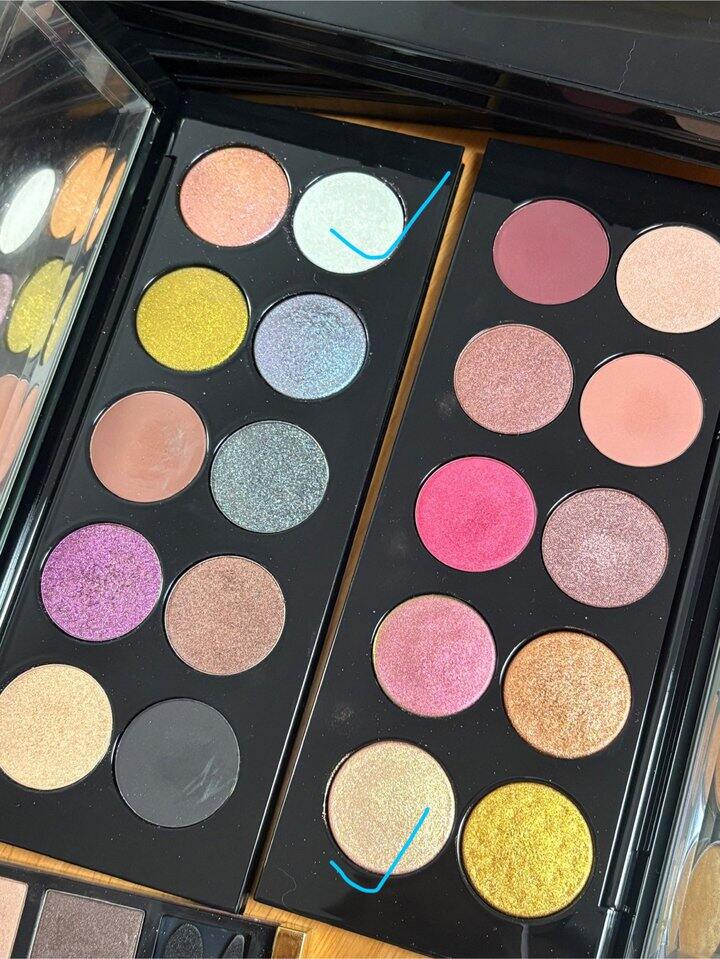 下图以tf35和tf20为例,要是画出的眼妆比较浑浊不够清透,可以试试图里的闪片大面积铺一下眼皮,再叠其他几颗颜色(特别是20,用原本的打底色再叠那颗金属蜜桃色我用特别显老,但是闪片直接+左下就很清透了)。