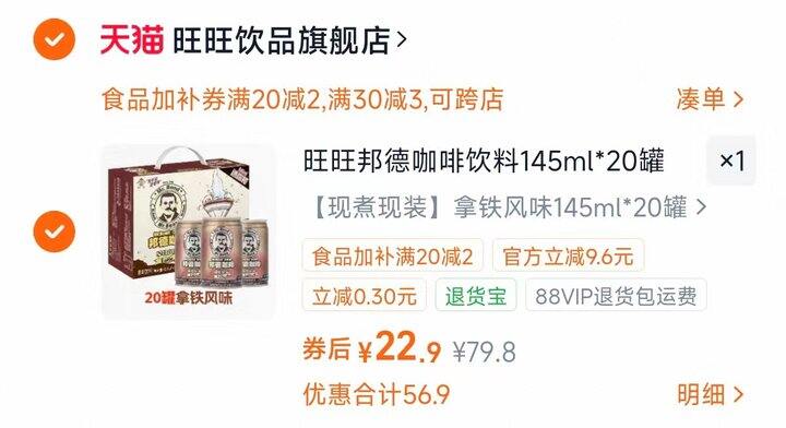 💰1.1/罐 旺旺邦德咖啡拿铁低糖