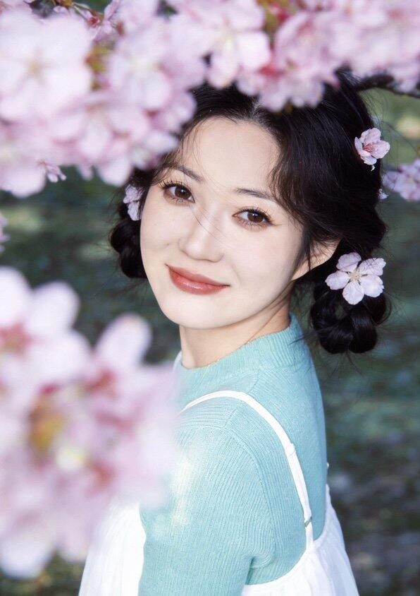 2. 侧身,脸颊贴靠樱花枝,眼神看向镜头,笑容明媚灵动