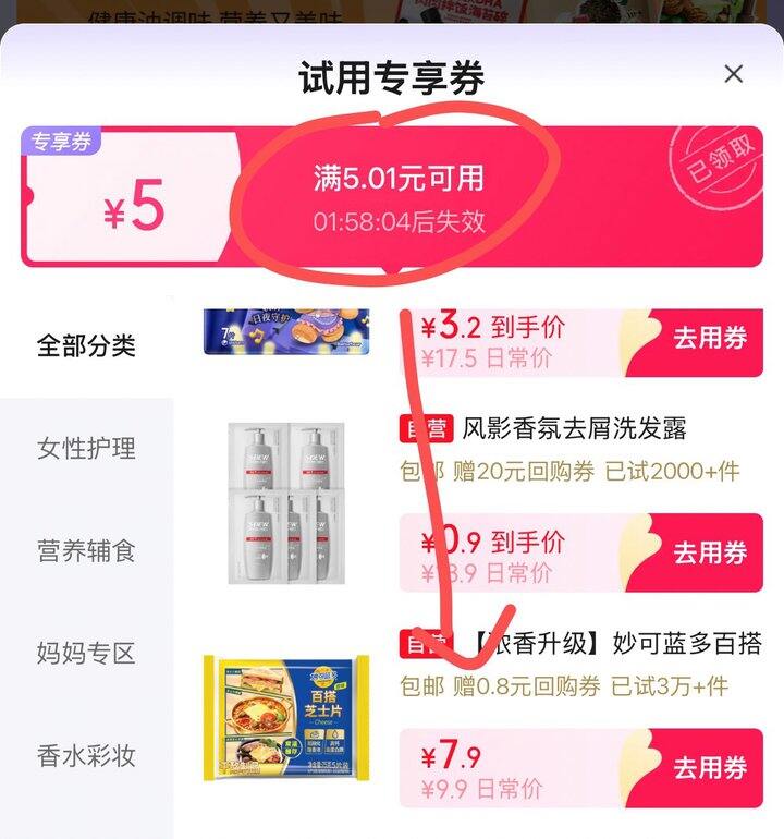 如图在领5券界面下拉找到此款拍下2.9妙可蓝多百搭浓香芝士片75g/5片