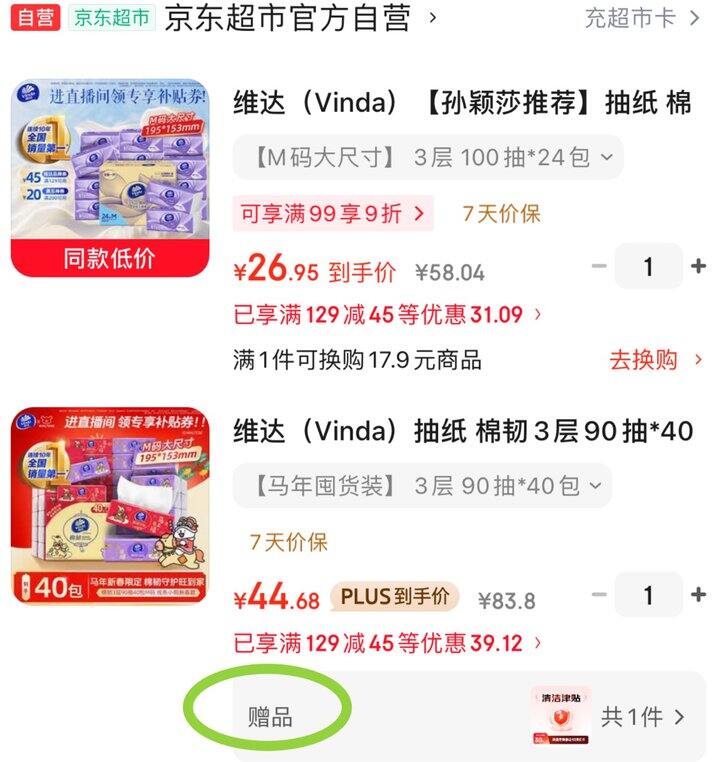 ❶ 维达(Vinda)抽纸 棉韧3层90抽*40包M码
