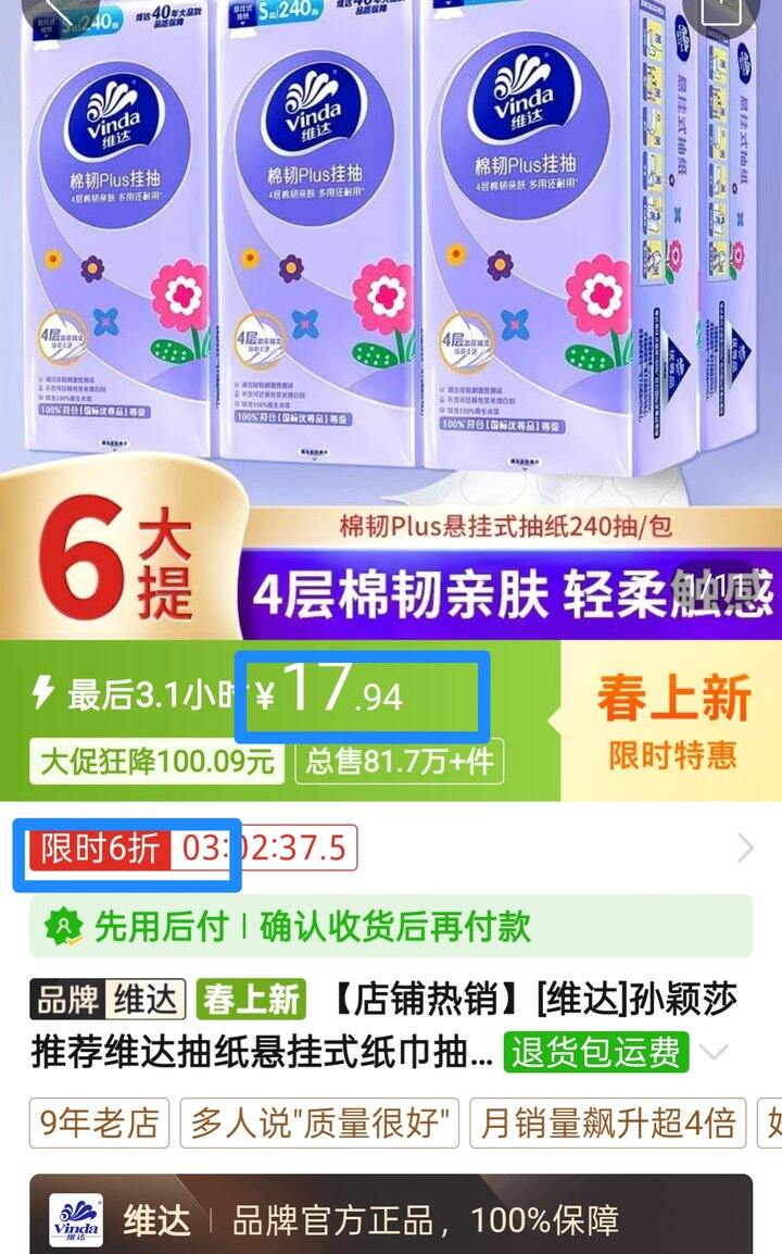 🍎维达棉韧plus挂抽2.99/提/240抽