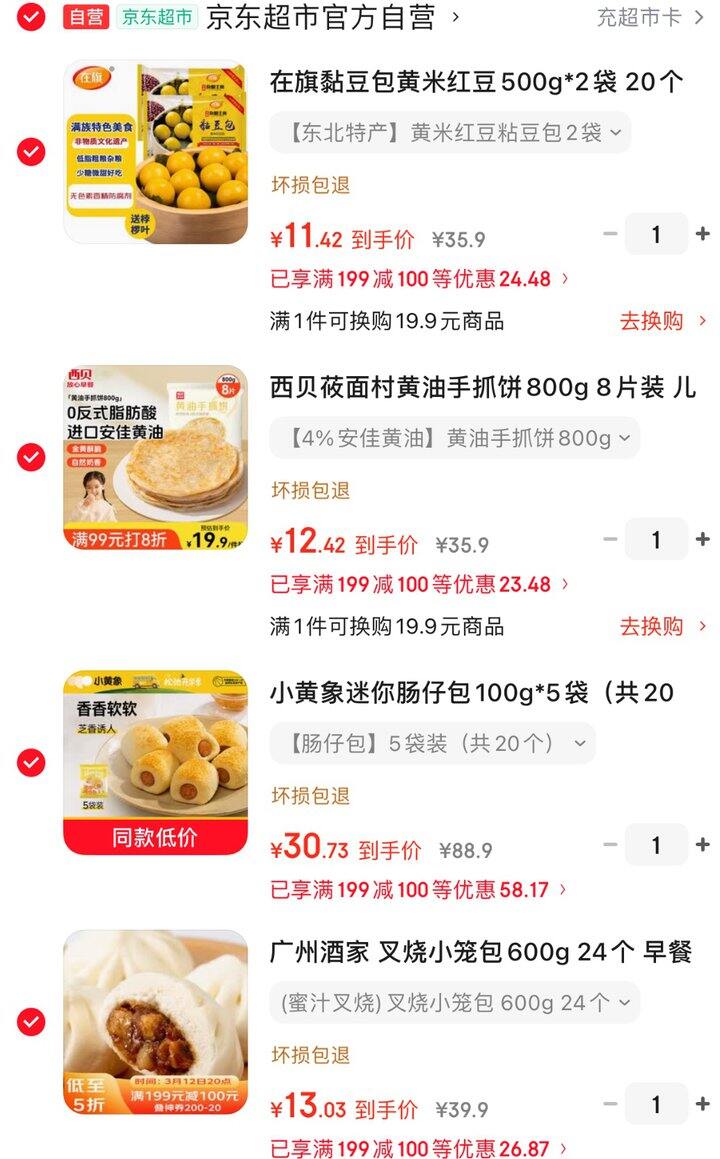 手抓饼12.42,肠仔包30.73,小笼包13.03,黏豆包11.42❗