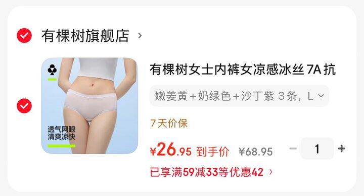 ❷ 有棵树女士内裤凉感冰丝7A抗菌纯棉裆3条