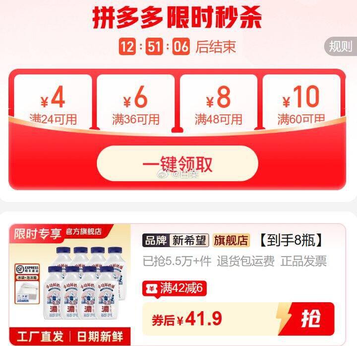 PDD【41.90】新希望.鲜牛奶455ml*8瓶,折5.23/瓶,顺丰包邮,旗舰店的活动。 https://p.pinduoduo.com/IgI8hCHv?sc=EFAC