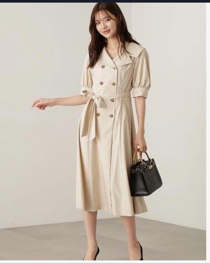 MF287 「日单双排扣大翻领连衣裙女86102春夏泡泡袖收腰显瘦长款A字风衣裙」