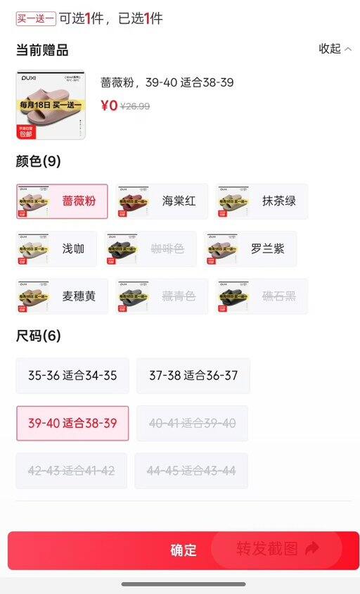拖鞋赠品也可以选择尺码的,不需要拍两双一模一样的记得赠品切换颜色尺码
