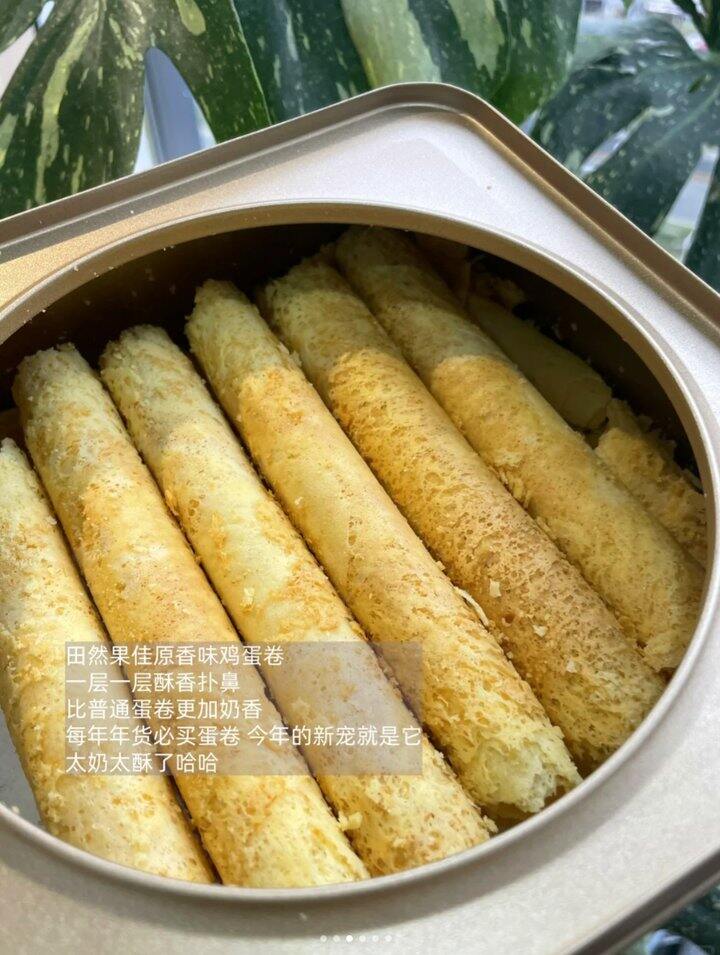 超级酥软,轻轻一咬,蛋卷就一层一层脱落到嘴里,这应该是作为鸡蛋卷的标配属性,但是果佳这款黄油鸡蛋卷不仅做到了这个,还有一点是我最喜欢的,就是她没有加起酥油,没有加食用香精,靠的就是黄油,鸡蛋,乳粉等带来的香味~