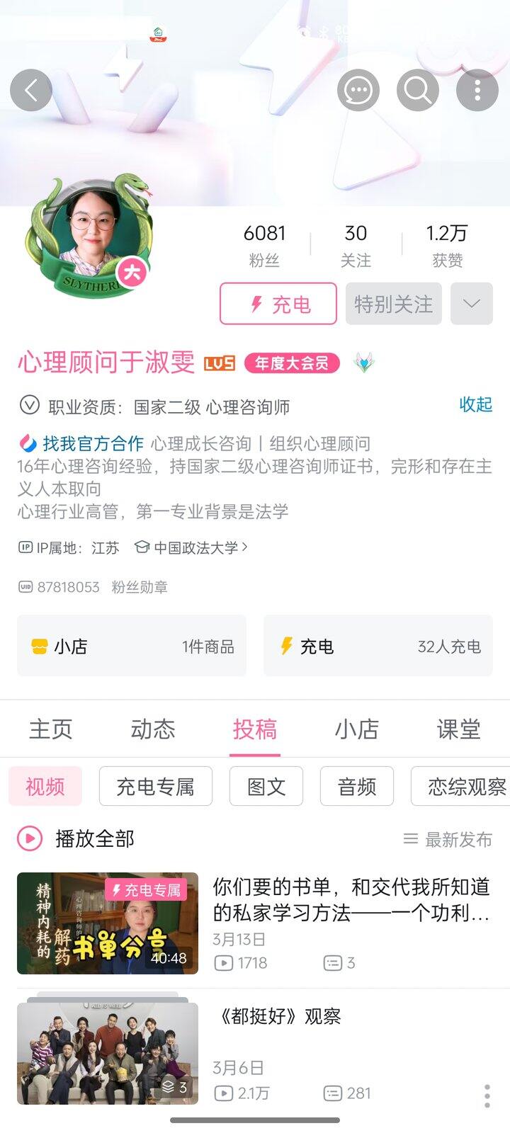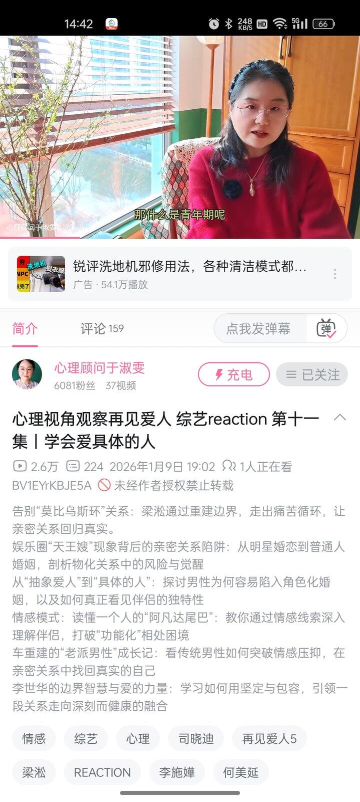 再给大家推荐一个UP,我这几天没事在听她的恋综分析,她不情绪化拉偏架,也不会对嘉宾有什么人身攻击,我觉得在一众针对影视作品进行解说的观点输出型博主里,她是比较客观中立的,而且言之有物。(我们有很多观点是一样的,所以我觉得她说得很好(=゜ω゜)ノ。嘿嘿)她的视频都比较长,适合当播客听。而且她的吐槽也有点儿冷幽默的感觉,一本正经说了一句逗你笑的话:-D。