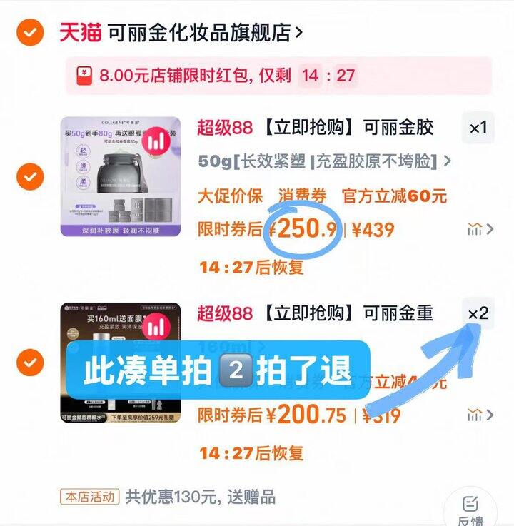 📣回到购物车可丽金把数量2️⃣改为1️⃣