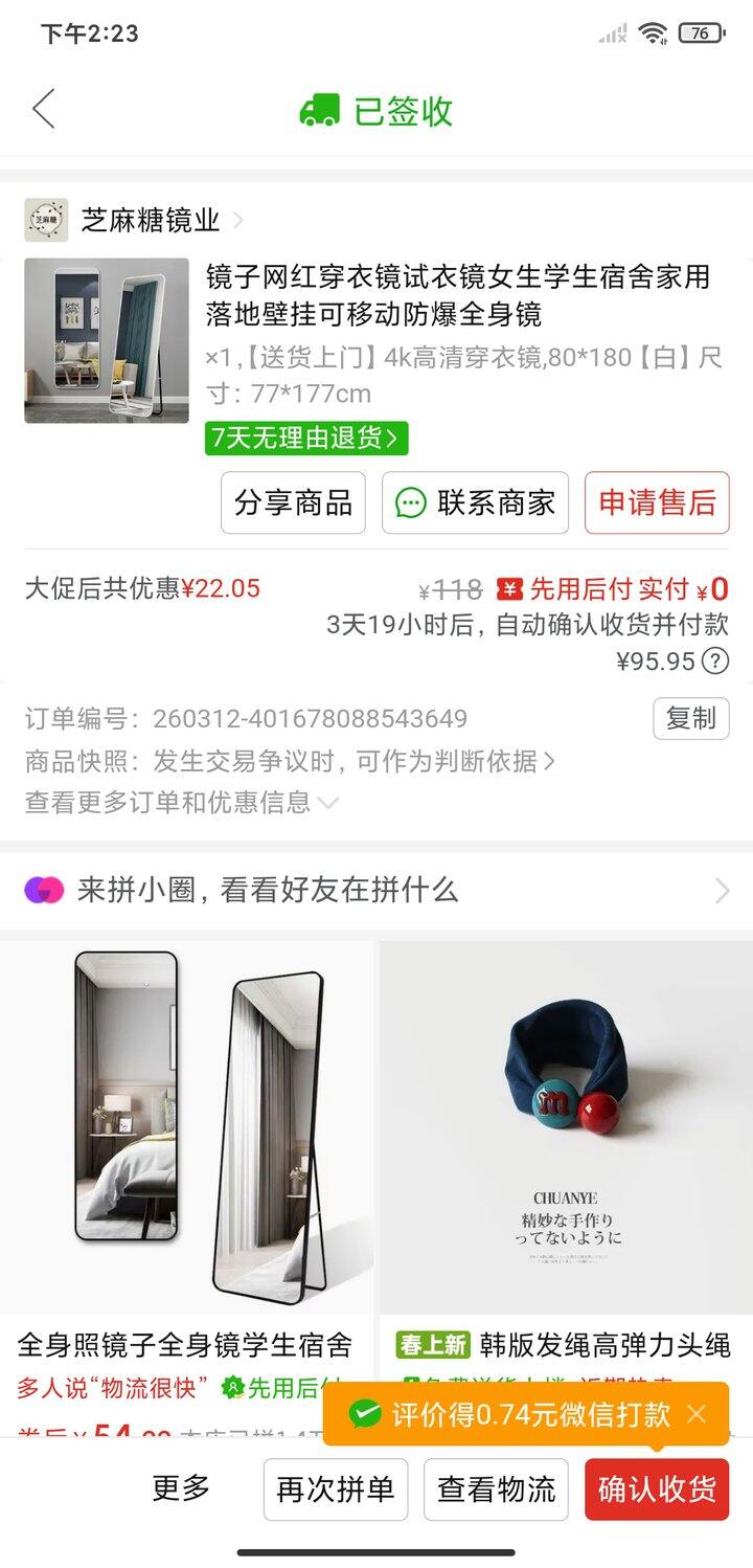 这个镜子已经到货了。我发现镜子就得在拼多多买,比淘宝便宜也不需要凑单。