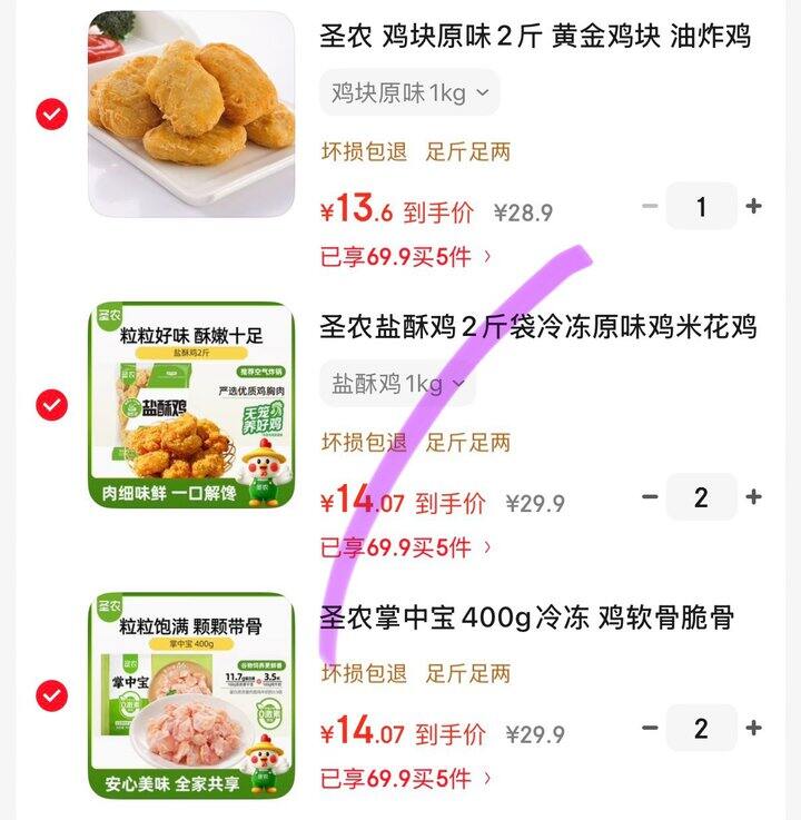 💰69.9包邮,折13.98/件💰 任选5件加购:圣农掌中宝400g https://u.jd.com/c1Lropa / 圣农盐酥鸡2斤袋https://u.jd.com/cGLqu1M / 圣农鸡块原味2斤https://u.jd.com/c1LatHJ