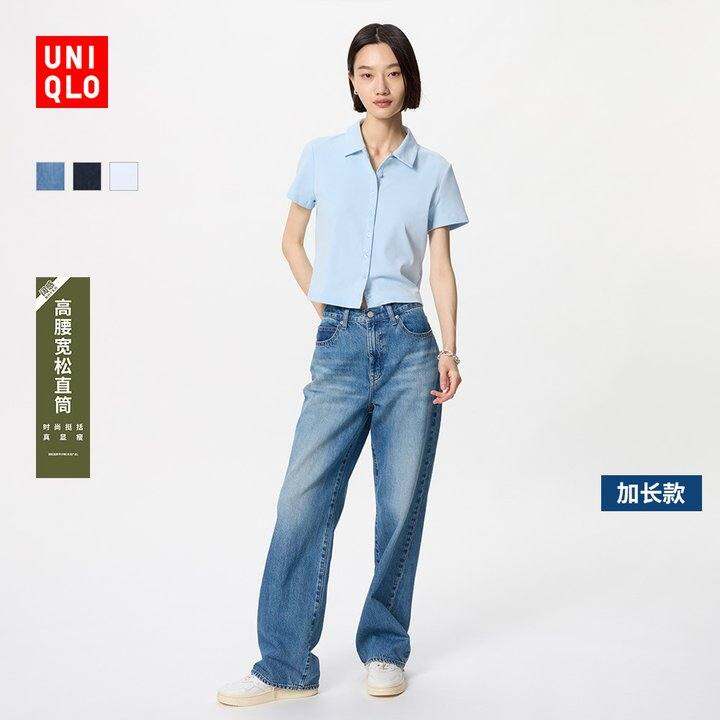 Uniqlo女装宽松直筒牛仔裤水洗产品阔感裤加长款81.5cm新款476089