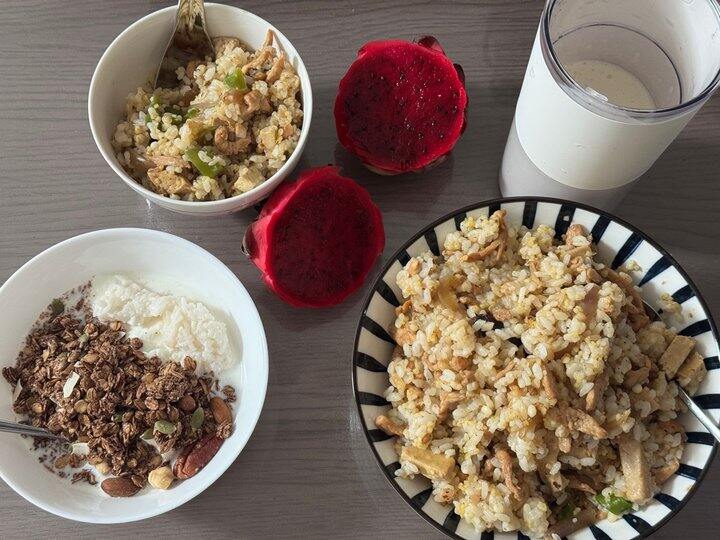 晚餐 牛奶酸奶酒酿燕麦 香蕉奶昔 炒饭