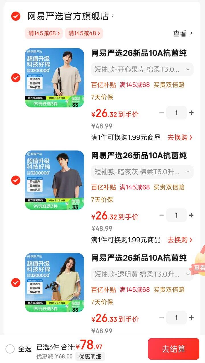 26.3/件!网易严选 抗菌纯棉短袖