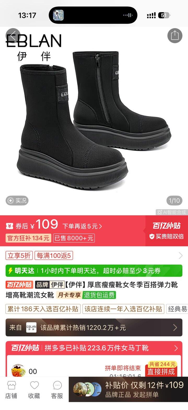 最后推荐伊伴的这双小靴子,这个冬天的最爱!矮子乐!显瘦!又不像靴子搞不好会滑下,堆积在脚踝。鞋子是那种布的,防水布那种,鞋垫是皮的,之前我pdd蹲了90买的,冬天穿得最多,百搭的。