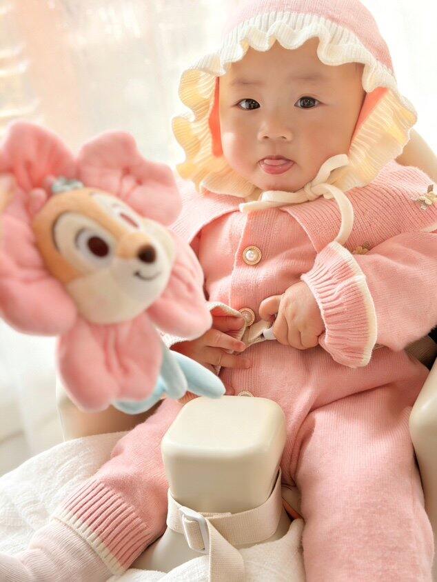 帮我生成图片:合并两张图片,人物整体包括五官表情不变,在婴儿皮肤形成自然细腻真实高光,将背景的墙面换成暖白色透光窗帘并虚化背景,人物下方为白色棉麻材质的布,整体风格温暖明亮氛围感。