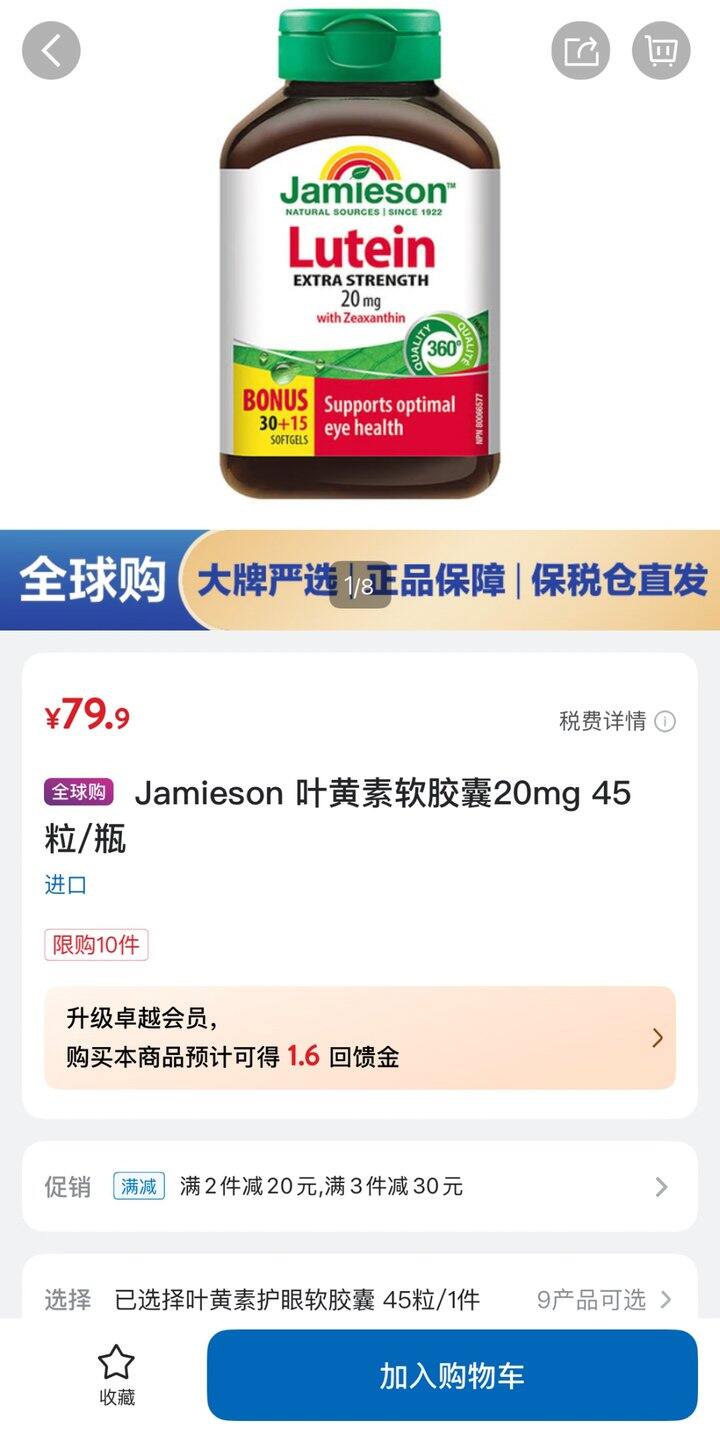 拍3,折33/瓶,好划算,山姆一模一样的79/瓶,成分是经典的叶黄素+玉米黄质,没有多余复配,作为日常营养补充很OK,