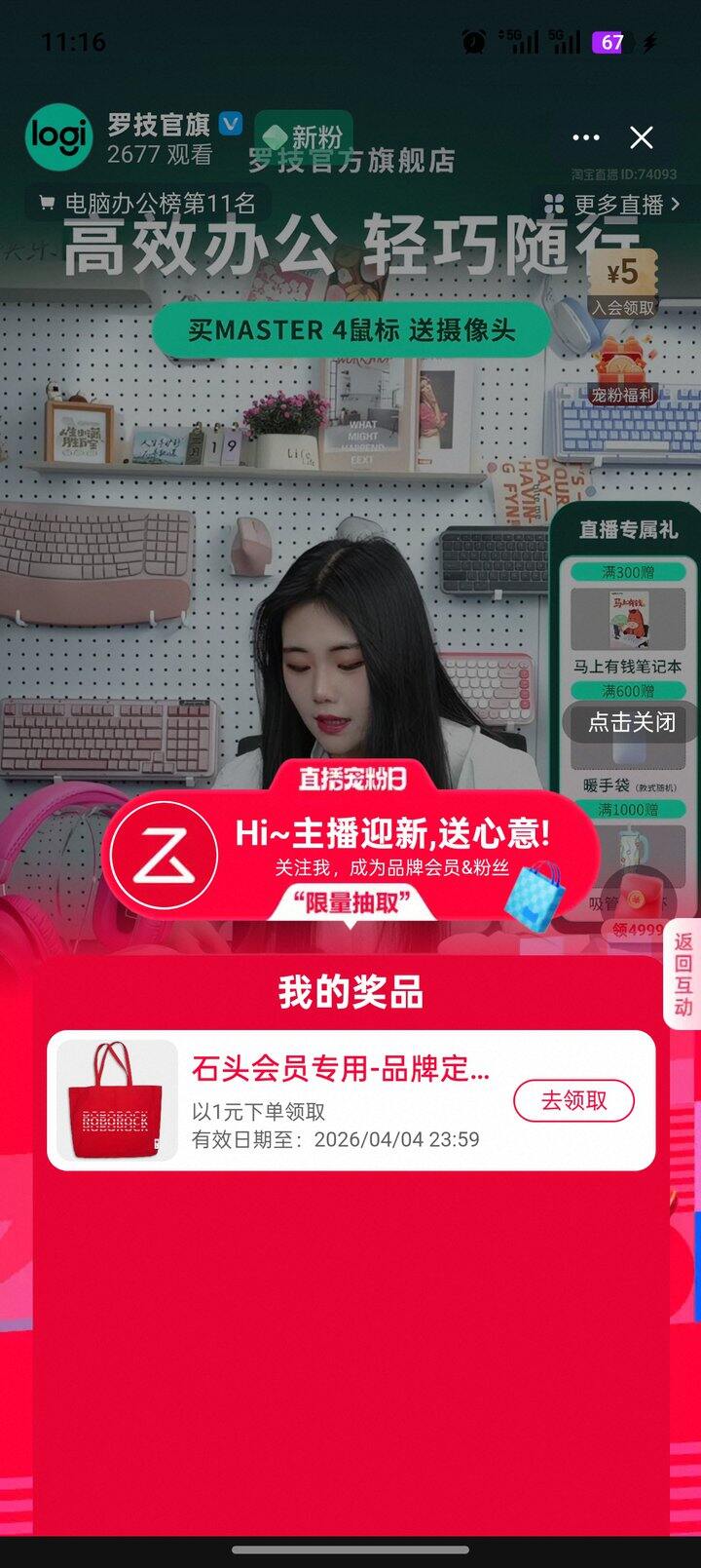 淘宝直播——罗技官旗——宠粉福利——加入会员——抽取1元购帆布袋