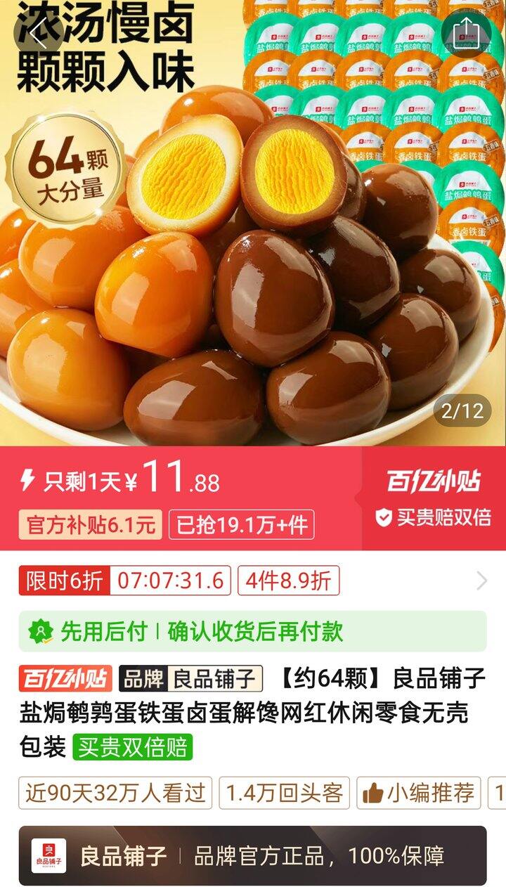 🍎11.88【约64颗】良品铺子盐焗鹌鹑蛋