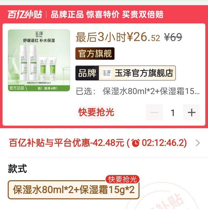 🍎玉泽皮肤屏障修护保湿水+保湿霜💰26.52