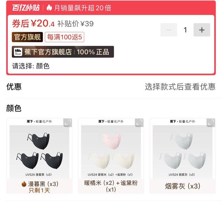 3只装蕉下户外服饰配件便携护眼角防晒口罩UV524