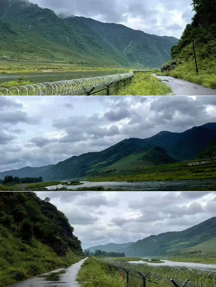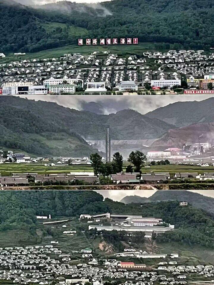 3、快到临江时能在路边看到对岸亚洲第二大露天铜矿——三月五日青年矿山。一排排白色的建筑是矿工的宿舍,据说山后一百公里就是长津湖。