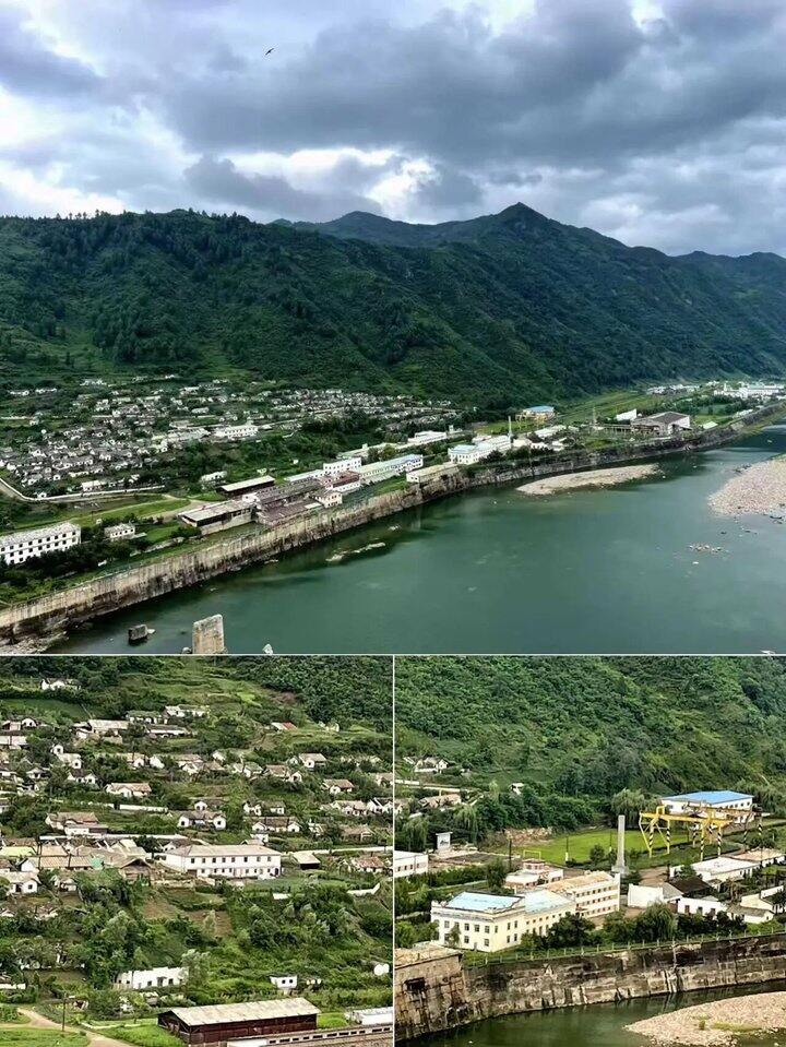 坝上立有两国界碑,站在这里可以清晰望见对岸朝鲜慈城郡的云峰里。