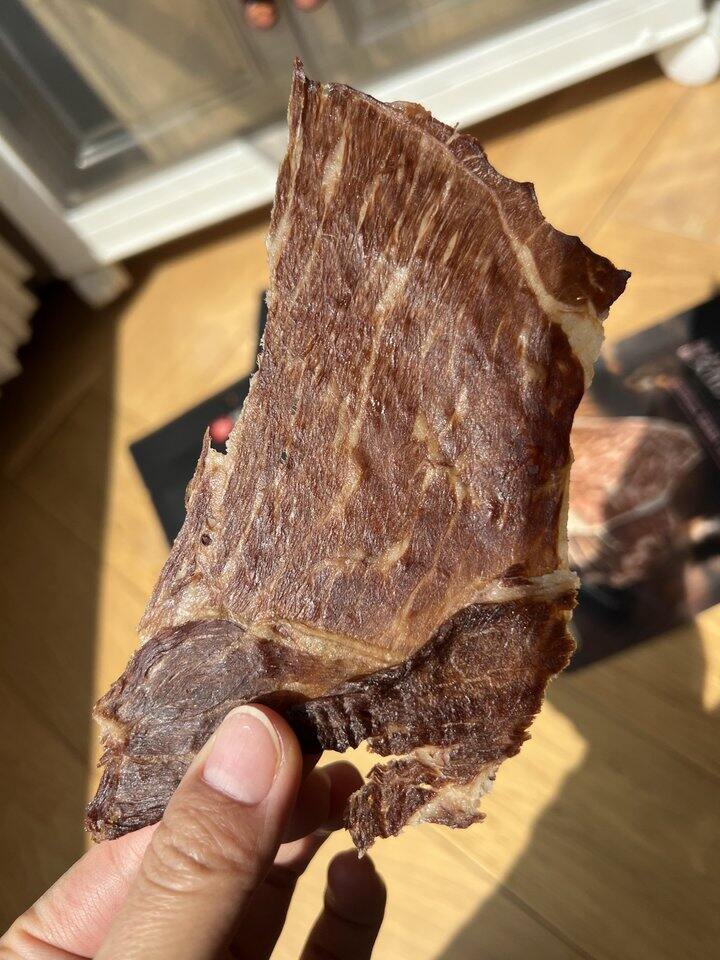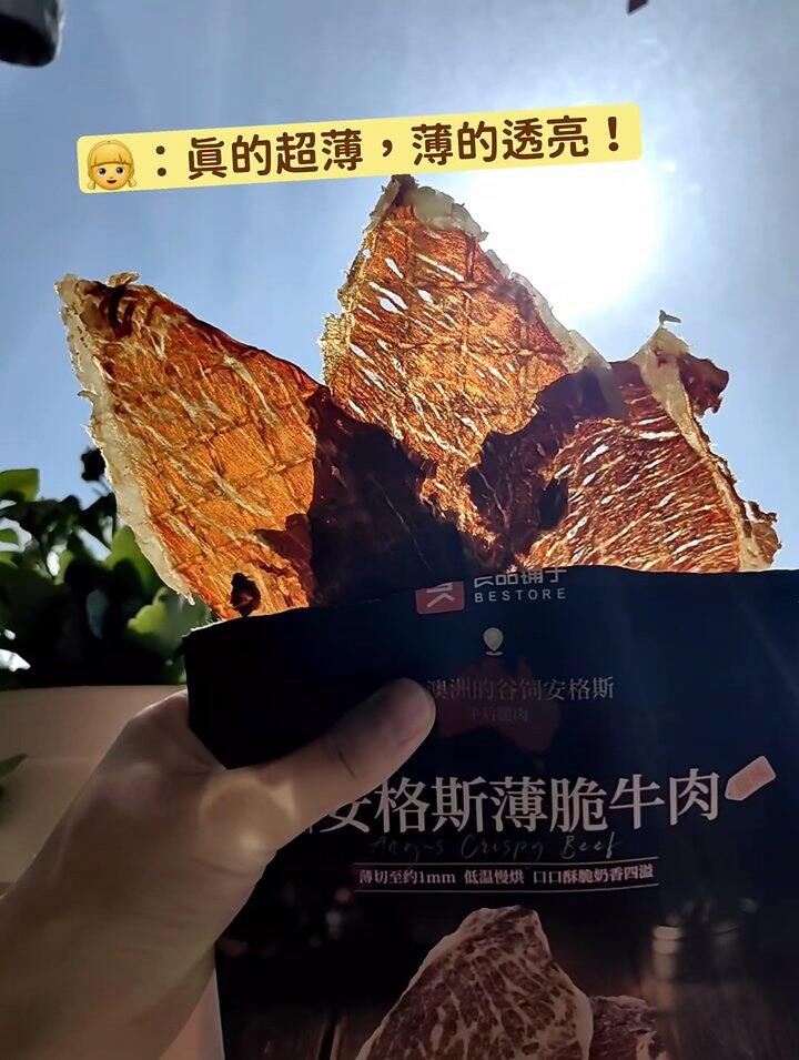 这个好吃,很薄一片,香香脆脆的,我之前买的桶装100g要79.9,还是袋装的实惠,最近安格斯牛肉大宗在涨价,不知道牛脆片后面会不会涨,